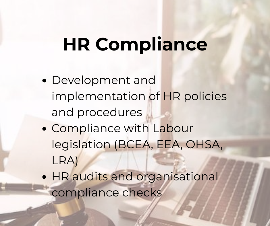 • Compliance with Labour legislation (BCEA, EEA, OHSA, LRA)