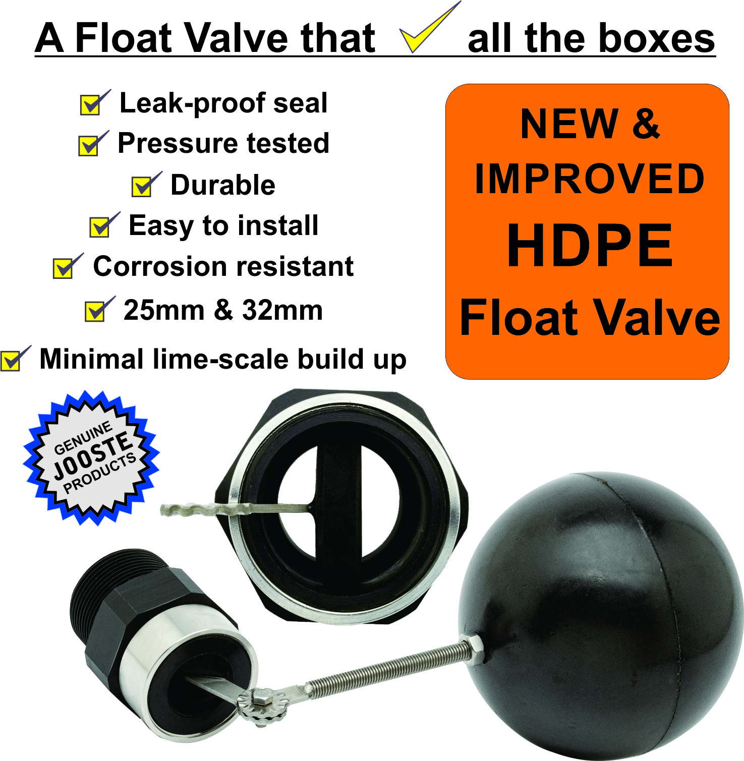 The ballvalve is large bore and is sealed with a butterfly valve which is mechanically opened and closed by a solid, closed cell polyurethane float. The valve is made up of a stainless steel insert and cast into a polyurethane sealing valve. The advantage of using the solid, closed cell float is that it can be punctured and can even have a hole drilled through it without taking any water in and allowing it to always stay afloat. So next time your livestock try and bite the float to get fresh cold water it will not be damaged enough to lose buoyancy.