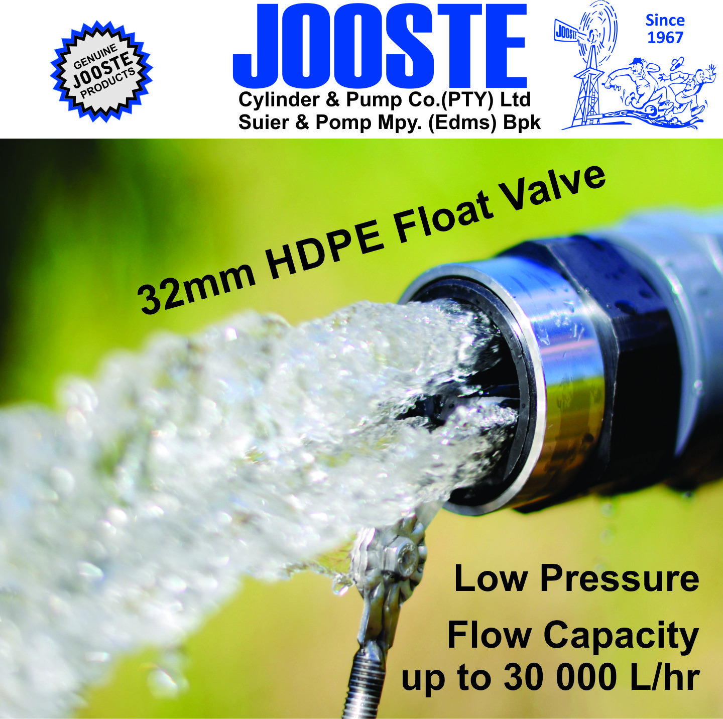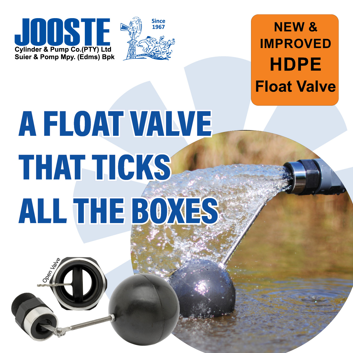 Being leaders in the borehole cylinder industry for so long has given us the insight and knowledge to identify issues within the farming industry and given us the opportunity to help solve those issues. That’s why over two decades ago the Jooste Cylinder’s high flow, high pressure and high quality ballvalve was first developed and has been constantly improved since then. Our NEW HDPE ballvalve was recently developed to improve maintenance and repair times making it ideal for “in the field” use and maintenance.